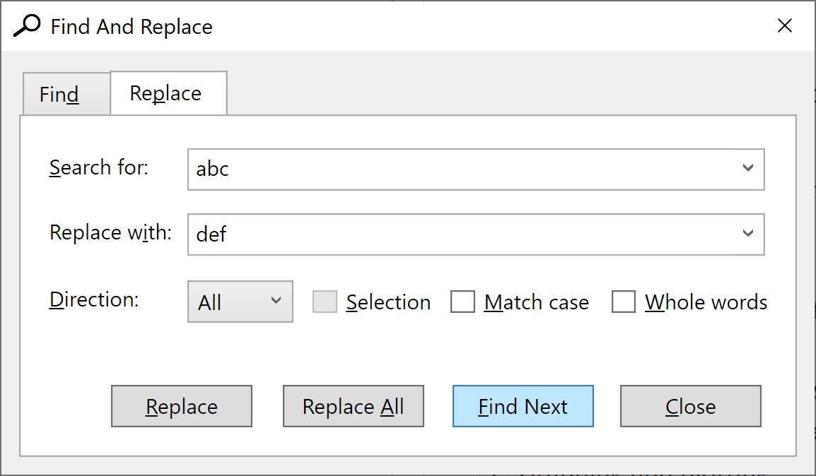 - Selection: It works only with the "Replace All" command. You need to make the selection first and then to display the "Find And Replace" dialog. Then, if you check the "Selection" options, all the replacements will be made only inside the selected text.
